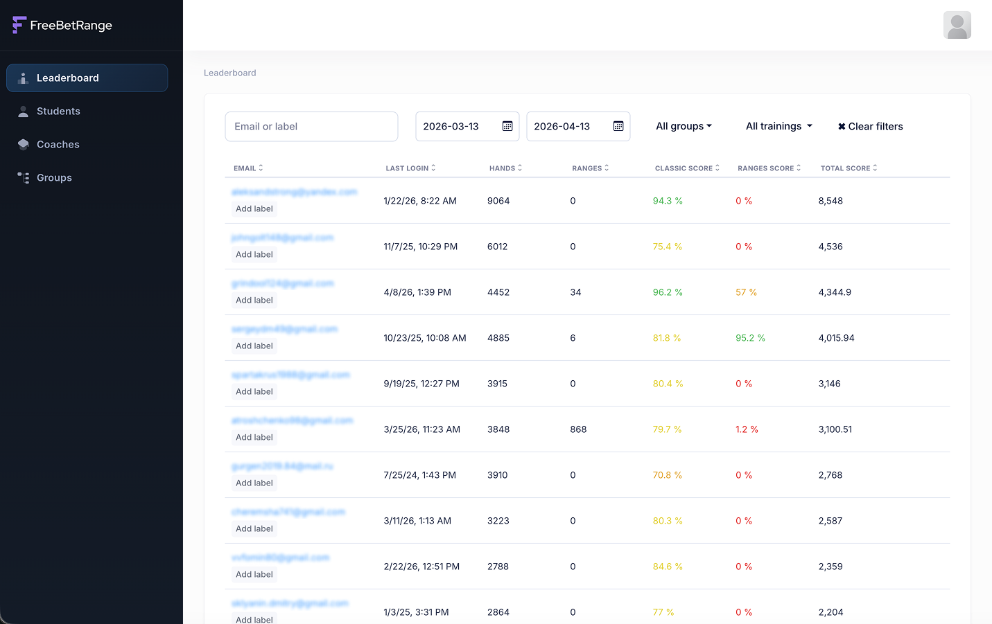 This is the main page of the dashboard, where you can track all your students' activity and training performance. For each student you can see their last login date, number of hands and ranges trained, score for each type of training, and overall score.